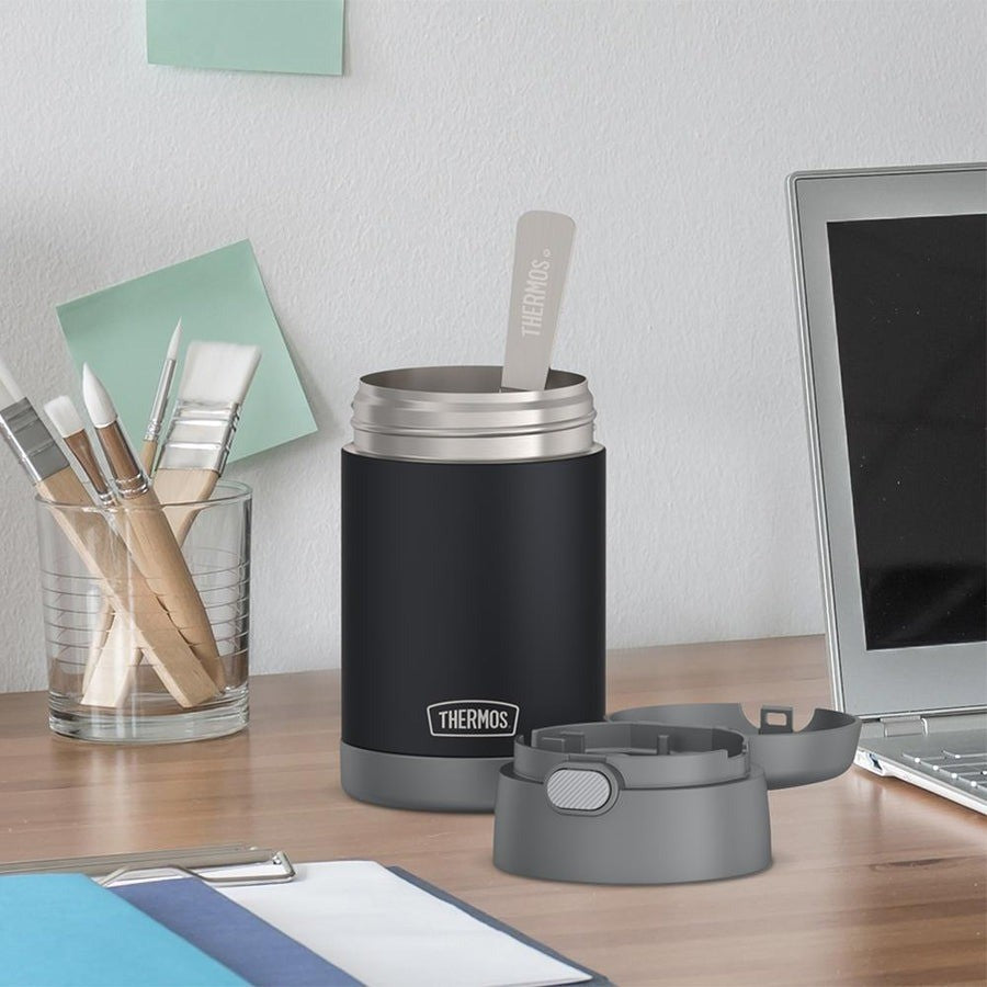 The FUNtainer has double walled vacuum insulation to keep food hot for up to 7 hours and cold for 9. The food jar features a false lid at the top that contains a reusable, foldable spoon. The FUNtainer has a twist off lid that seals tight, making it leakproof.