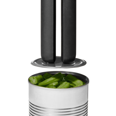 This unique can opener features a locking mechanism that secures the gadget against cans for easy cutting.