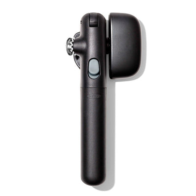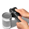 The can opener's magnetic handles even lift lids for hands-free disposal.