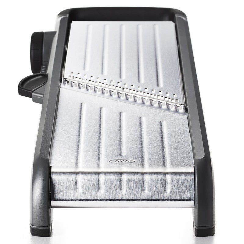 This mandoline from OXO features 21 blade settings, hardened stainless steel slicing blades and an easy-turn dial to change settings.