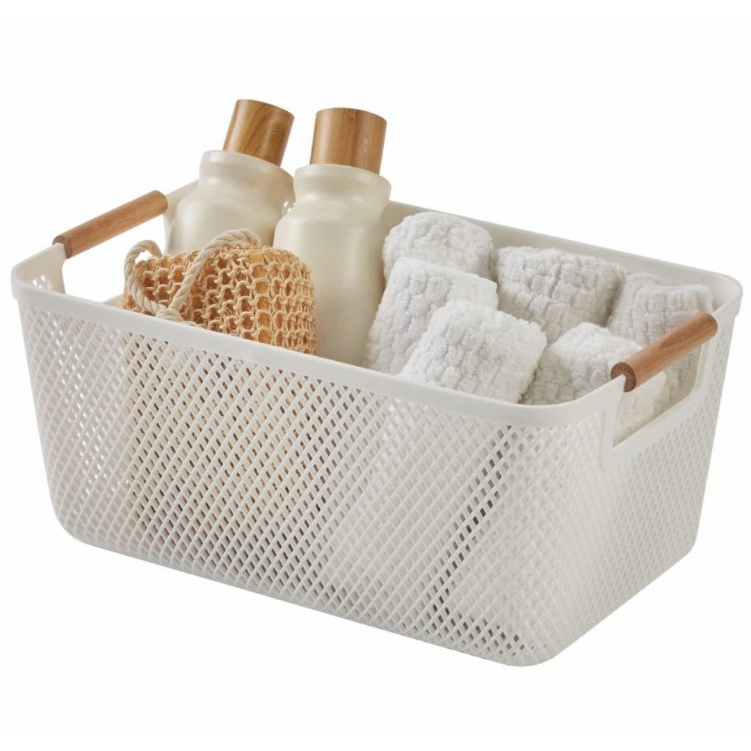 The plastic Malla organizing bin has a strong and sturdy design while also being conveniently lightweight. The bin features a mesh criss-cross design and integrated wooden handles for easy carrying.