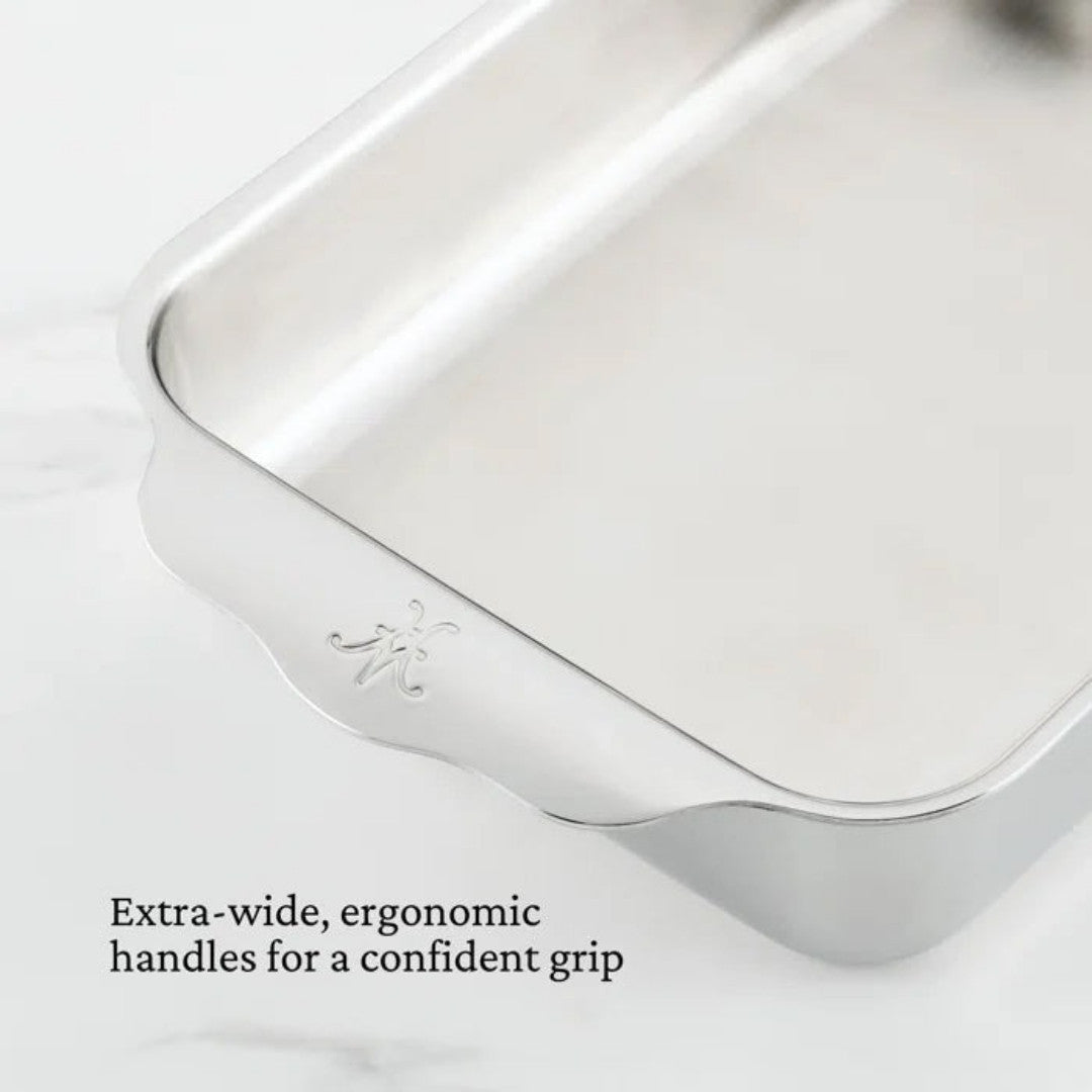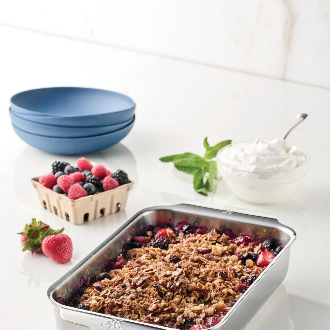 This rectangular baker is crafted from triple-bonded clad stainless steel with a responsive aluminum core designed to evenly emit heat, producing beautifully browned goods and perfectly roasted foods.