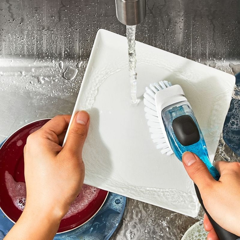 This OXO dish brush dispenses soap to give you a more effective cleaning solution for dirty dishes.
