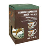Made of durable ceramic, these espresso cups features a vibrant contemporary indigenous design that sets it apart from any other dish. They have a unique glossy interior with a speckled matte exterior.