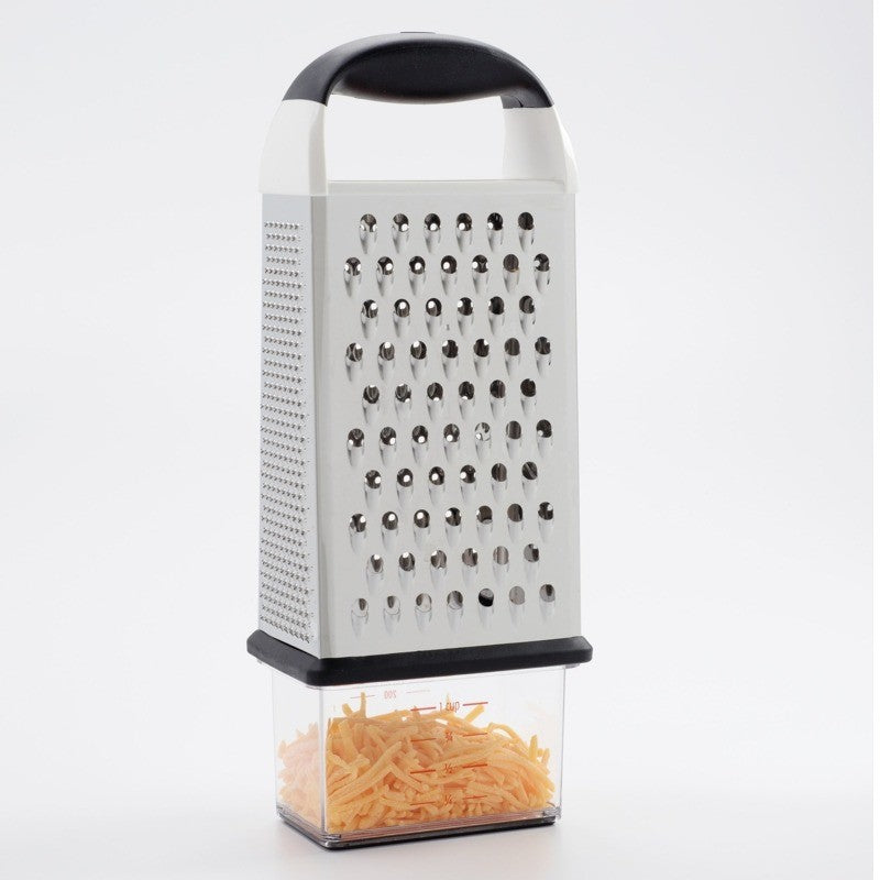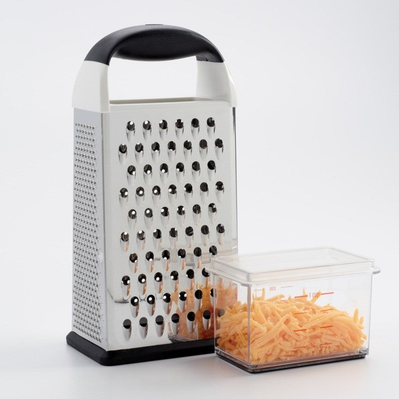 Great cheese with ease and comfort with the OXO Good Grips Box Grater. Featuring a storage container with measurement markings that clips onto the bottom, is perfect for storing your freshly grated ingredients. It also helps to eliminate the mess on a countertop. The OXO Good Grips Box Grater can be used to grate cheeese, nutmeg, ginger, apples, pears, zucchini and even potatoes to make sauces, pizza, pasta, salads, homemade hash browns and latkes and so much more!