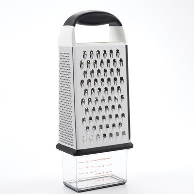 Made of durable stainless steel, the OXO Good Grips Box Grater also features soft handles for a comfortable grip, and a non-slip ring that keeps the box grater steady on a plate or cutting board. Slice, grate, store and prep with this all in one OXO Good Grips Box Grater. It is also dishwasher safe.