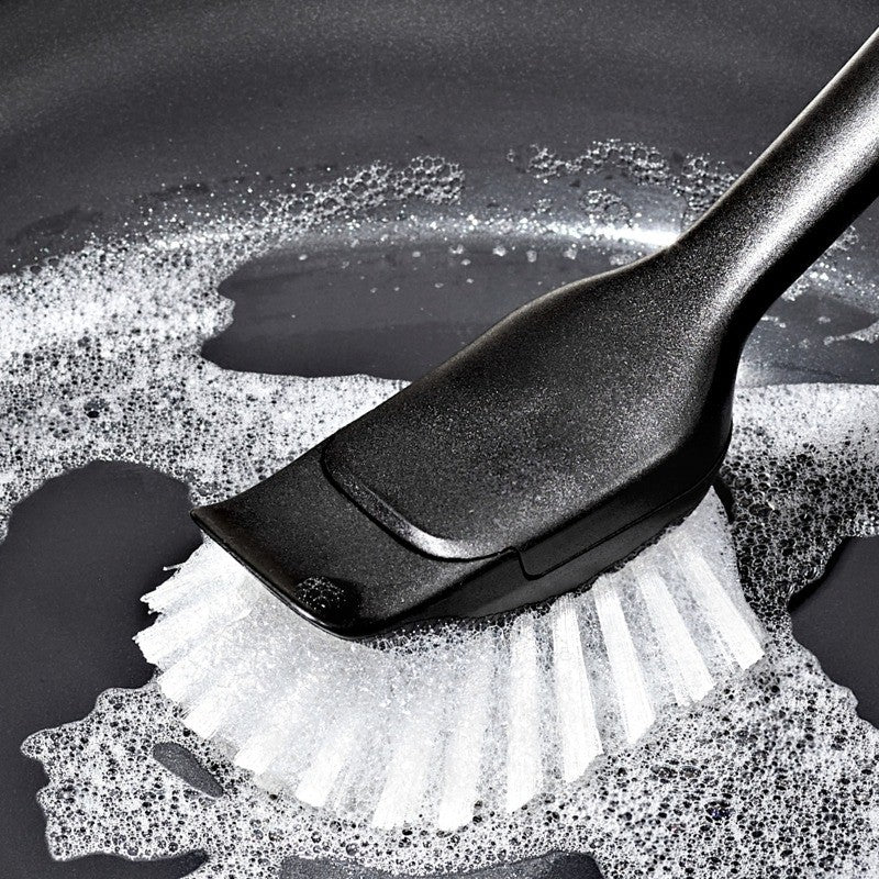 This OXO SteeL dish brush features a sleek stainless steel handle and durable nylon bristles easily scrub away baked-on food.