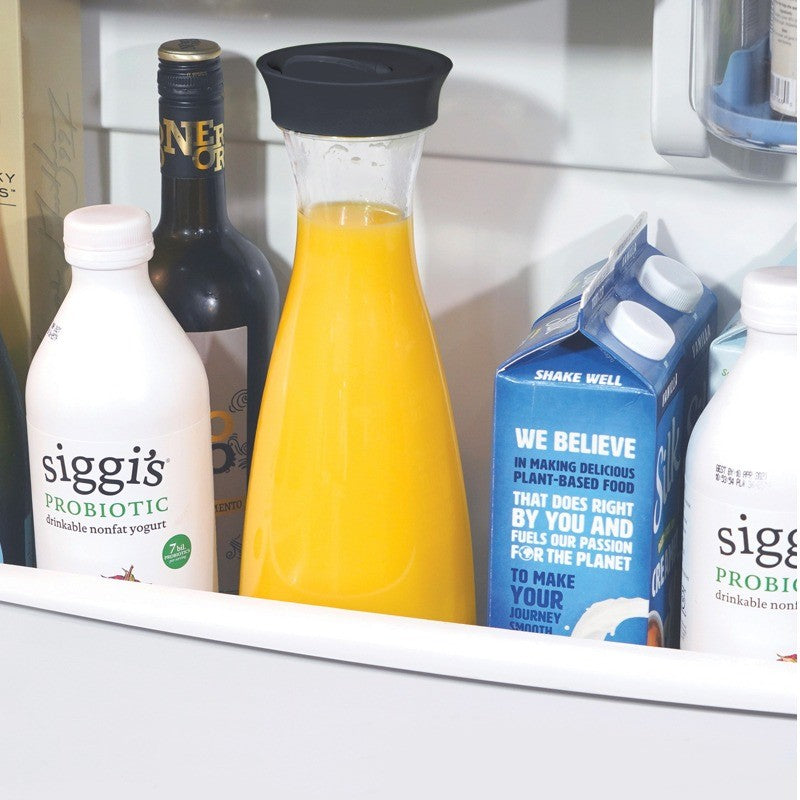 This OGGI carafe is made of shatterproof BPA-free plastic. It features a flip-open lid and extra-wide mouth that is easy to fill and can fit ice cubes.