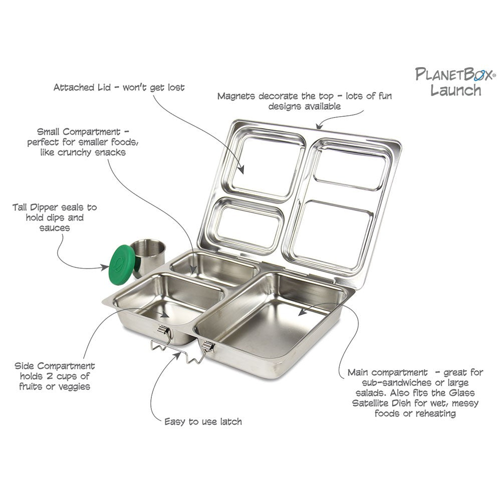The PlanetBox Launch Stainless Steel Lunch Box works best when paired with other PlanetBox accessories like magnets or carry bags!Want a good deal? Save 15% on your first regular priced online order when you sign up!