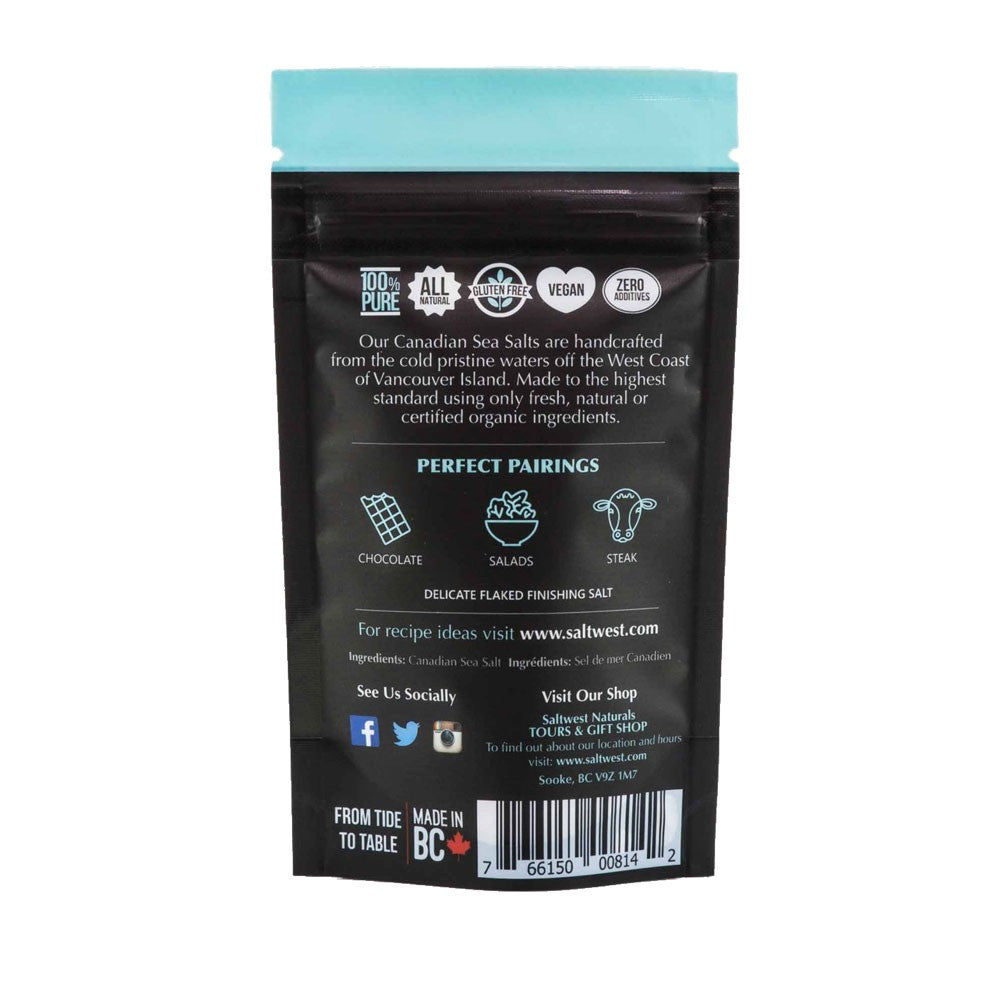 The SaltWest Naturals Raincoast Flor de Sal is a Canadian made version of the favorite French seasoning, Fleur de Sel. Similar to Fleur de Sel, the SaltWest Naturals Raincoast Flor de Sal is hand harvested, and is ideal for bringing finished dishes to life. The SaltWest Naturals Raincoast Flor de Sal would be a great topping on baked desserts, caramels, chocolates, and a variety of other more savoury dishes.