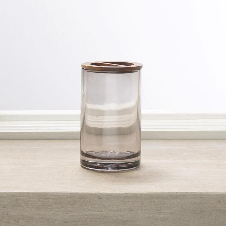 The Vaso toothbrush holder from Moda At Home has a thick glass body and features a stylish dark wood top.