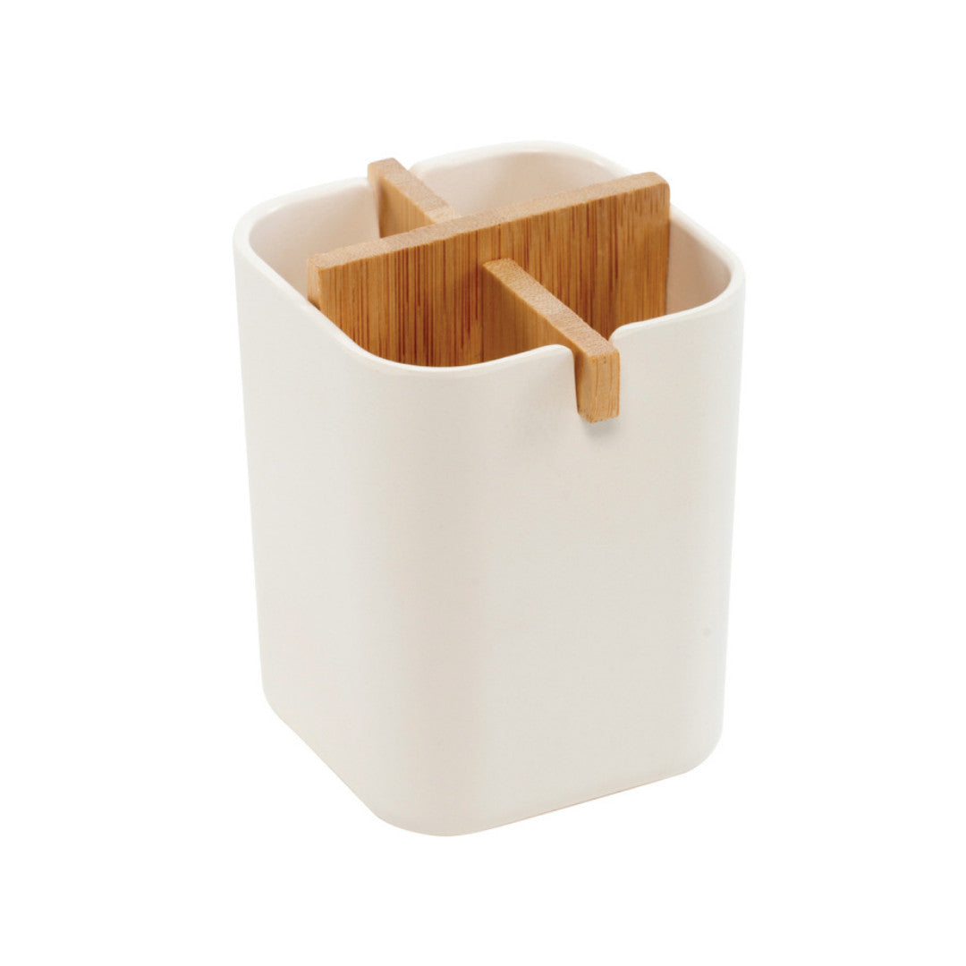 This organizer is made of sturdy ceramic and features removable wood dividers. This gives you the option to have 1, 2 or 4 slots to organize with. The white and natural wood colour scheme will also stylistically compliment any bathroom in your home.