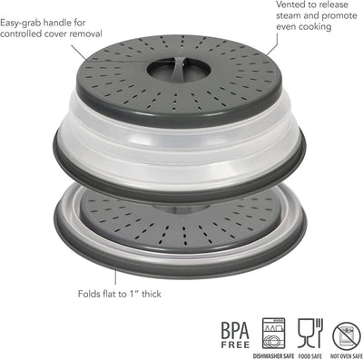 The food covers fit most standard sized microwaves and are collapsible to just 1" H for compact storage. They feature an easy grab handle, as well as vents to release steam and moisture to ensure quality cooking.