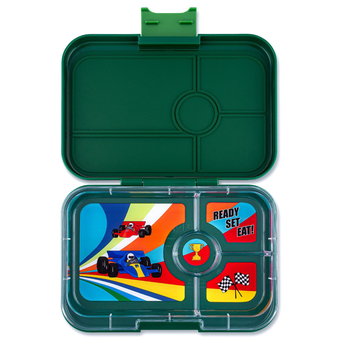 The tray has one main compartment for holding sandwiches or entrees, two smaller sections for fruits, veggies and other snacks, as well as one dip well.